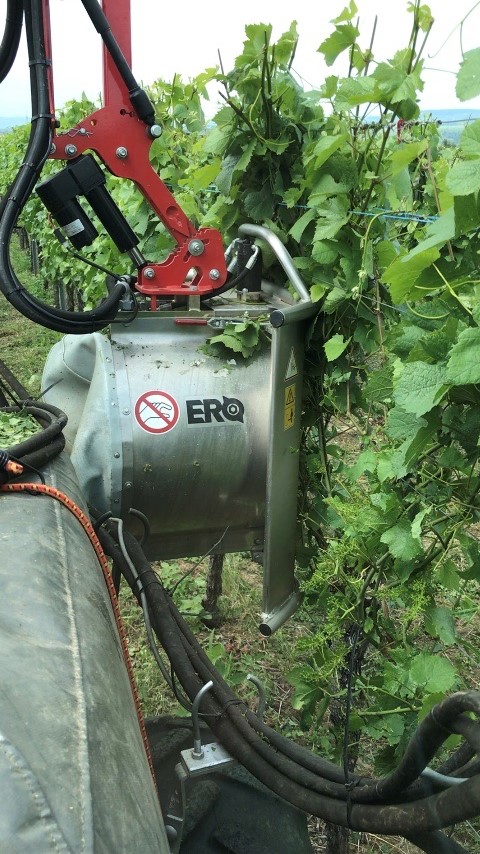 Maschinelle Entblätterung ihrer Weinberge mit einem Entblätterer der Marke „ERO“.